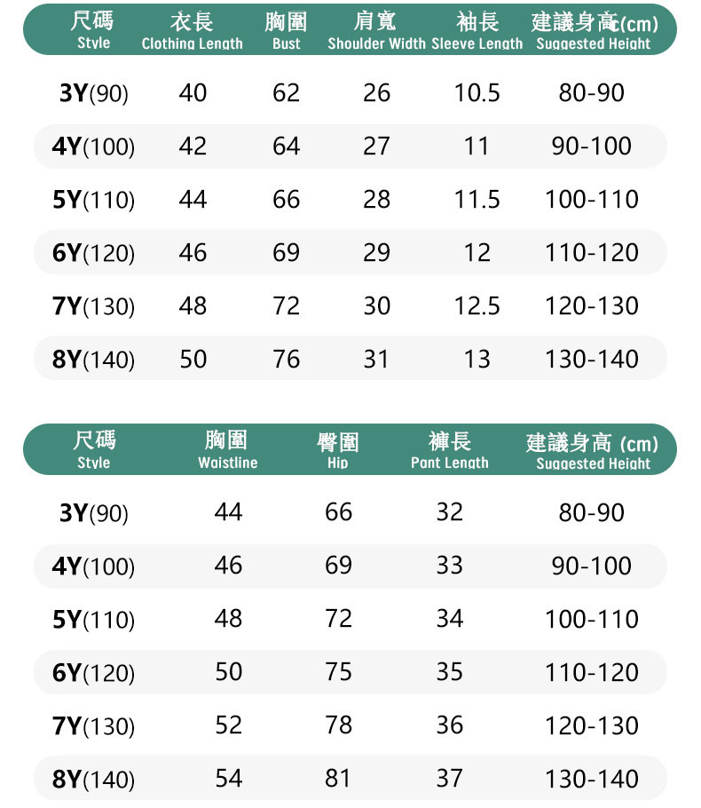 適用性別:女套裝件數:兩件套裝適合年齡層:中小童(3~8歲,100~140cm)適合季節:夏季袖長:短袖褲長:短褲布料:100%棉顏色:211746,211737適合身高:90cm-140cm