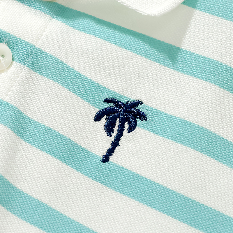 商品描述適用性別:中性風格:歐美袖長:短袖適合年齡段:中小童(3~8歲,100~140cm)適合季節:夏季面料:100%棉領型:圓領顏色:條紋椰樹適合身高:90cm-140cm