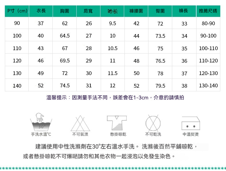 ※ 深淺衣物請分開洗滌;請勿長時間浸泡、濕放,以防染色。