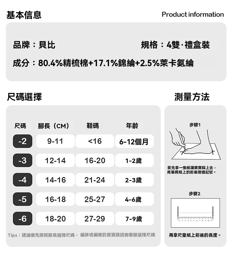 童襪尺碼:0-12個月(適合腳長9-11cm鞋碼16以下),1-2歲(適合腳長12-14cm鞋碼16-20),2-3歲(適合腳長14-16cm鞋碼21-24),4-6歲(適合腳長16-18cm鞋碼25-27),7-9歲(適合腳長18-20cm鞋碼28-31),10-12歲(適合腳長20-22cm鞋碼32-34), 13-14歲(適合腳長22-24cm鞋碼34-36)