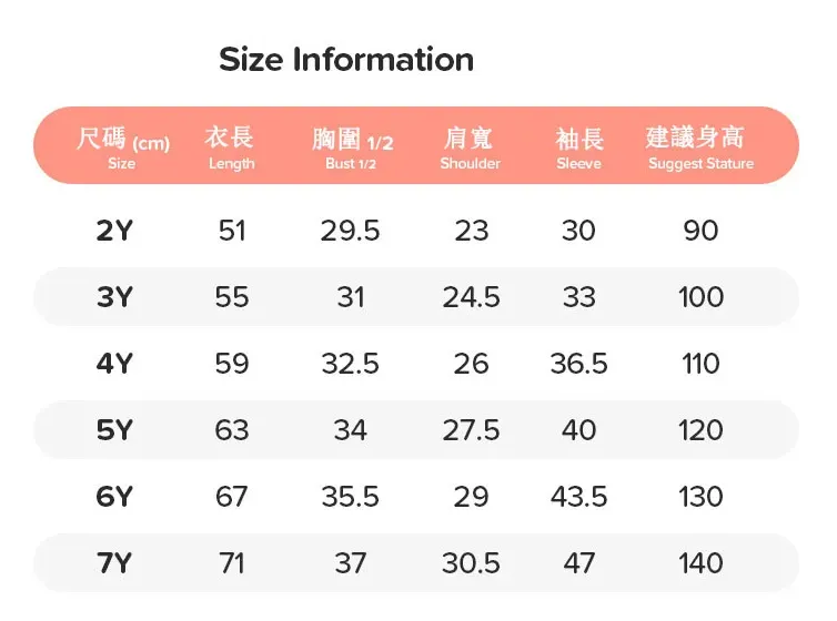 2Y(90cm),3Y(100cm),4Y(110cm),5Y(120cm),6Y(130cm),7Y(140cm) |