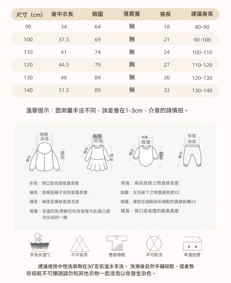 ※ 深淺衣物請分開洗滌;請勿長時間浸泡、濕放,以防染色。